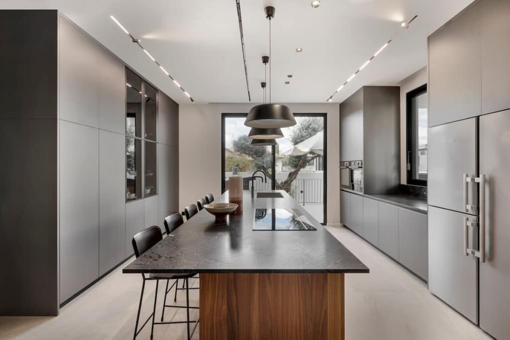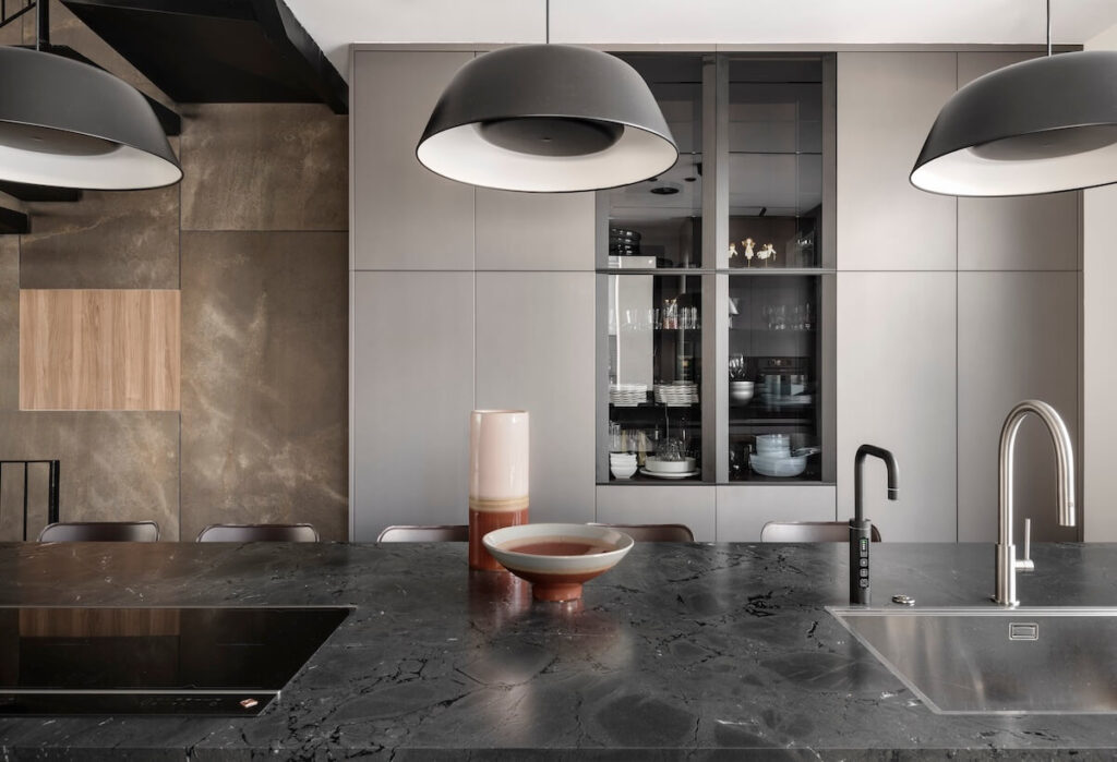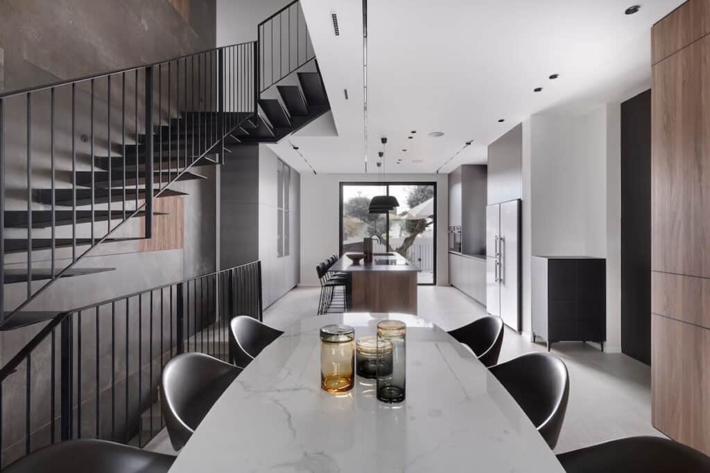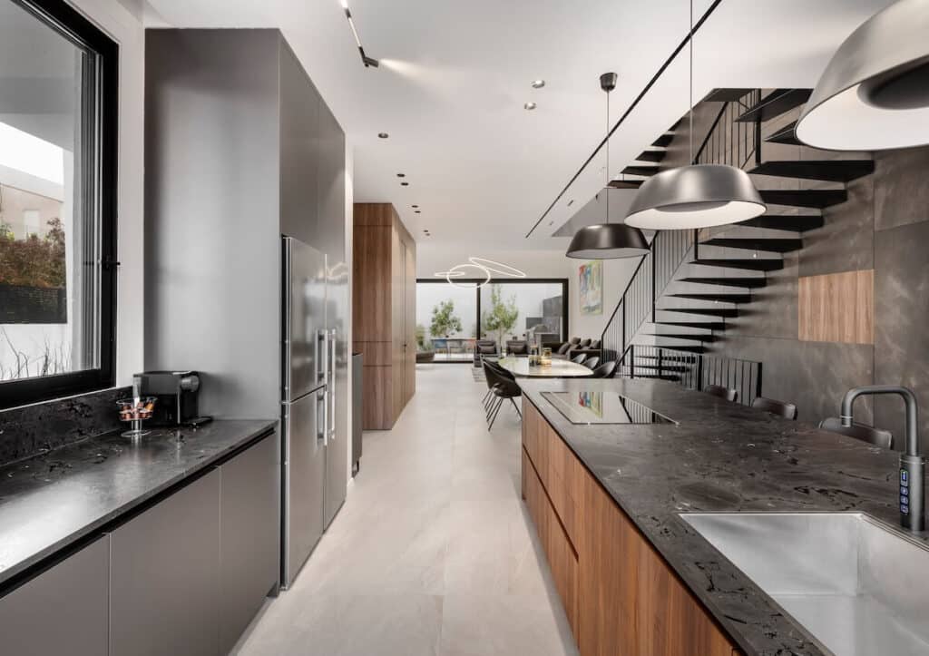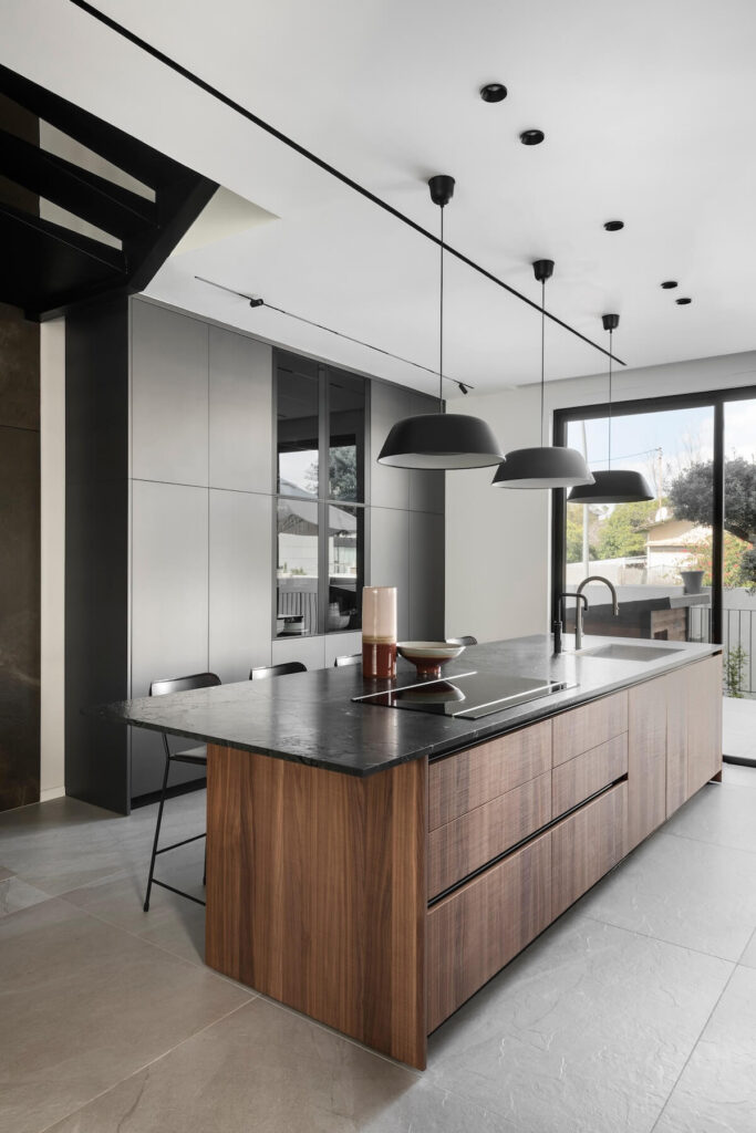 Pohostinské patro je navrženo s moderní estetikou, s doteky přírodních materiálů, jako je kámen, dřevo a kovy, což vytváří elegantní a luxusní atmosféru. Uprostřed souběžné kuchyně stojí velký kuchyňský ostrůvek: "Rodina u něj ráda tráví společné chvíle a připravuje rodinná jídla, stejně jako v jejich předchozích domech, které jsem pro ně navrhla," říká designérka. "Protože je rodina velkorysá a pohostinná, potřebovala jsem vytvořit co nejvíce úložného prostoru a zajistit pohodlné a příjemné posezení. Čela kuchyně byla natřena pokročilou technologií, která dodává kuchyňské desce jedinečný a luxusní kovový vzhled. Na jedné straně kuchyně jsem vytvořila vysoká čela skříněk a zakomponovala do nich skleněnou vitrínu orámovanou hliníkem a osvětlením pro dekorativní předměty. Uprostřed se nachází deska z přírodní žuly pod velkým oknem s výhledem do zahrady.