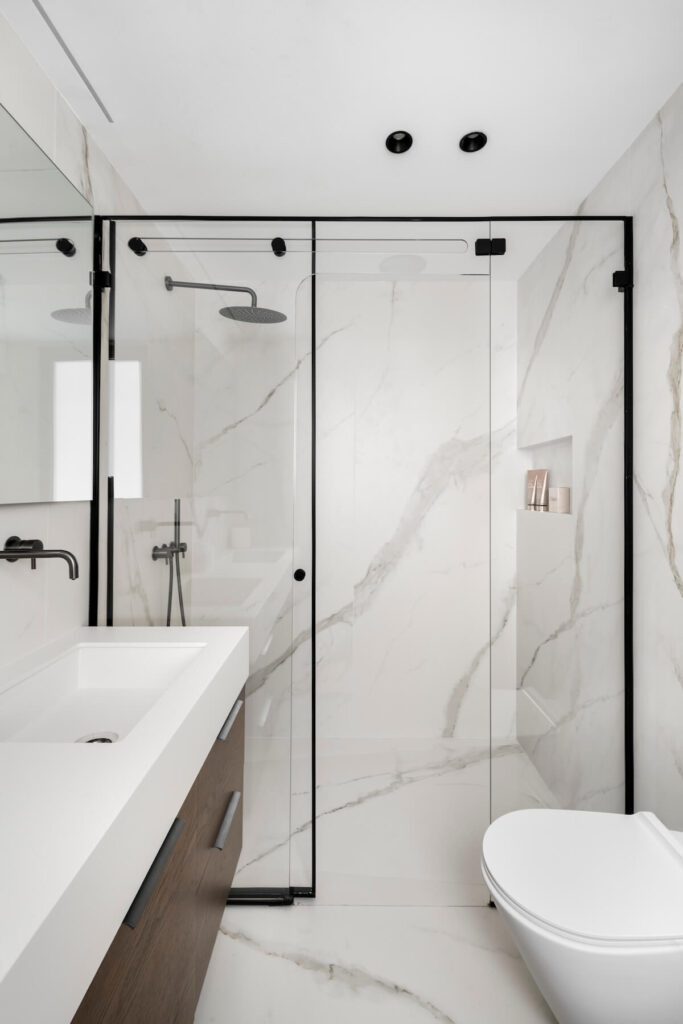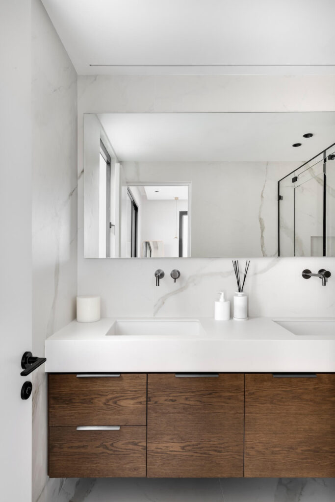 "I v hlavní koupelně jsme použili světlou barevnou paletu: stěny jsou obloženy velkými porcelánovými žulovými dlaždicemi se vzorem přírodního mramoru a nad vanu jsme instalovali dvojité umyvadlo z broušeného litého hliníku. Pro sprchový kout jsme vytvořili obzvlášť velký sprchový kout s vestavěnou lavicí a výklenky a zvolili jsme baterie v kartáčovaném provedení." "Horní patro je také věnováno dětem a z každého jejich pokoje je východ na dokonalý balkon, kde se často baví s přáteli. Každý z jejich pokojů byl navržen s pečlivostí odpovídající jejich věku a vkusu." Weinbren uzavírá.