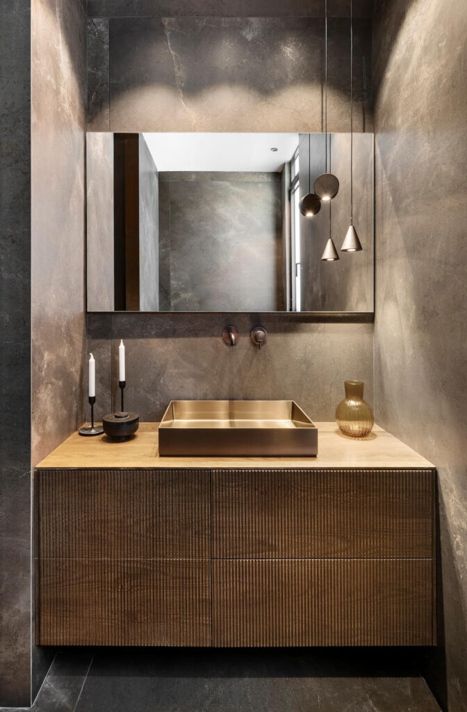 Prostorné koupelny pro hosty jsou zážitkem samy o sobě a jsou umístěny v dřevěné kostce se skrytými dveřmi na úrovni podlahy. Čela toaletních mís jsou obložena jemně opracovaným a křehkým ořechem Canaletto a nad nimi je instalováno dvojité umyvadlo z litého hliníku. Atmosféru dotváří vyspělý zvukový systém ovládaný na povel.