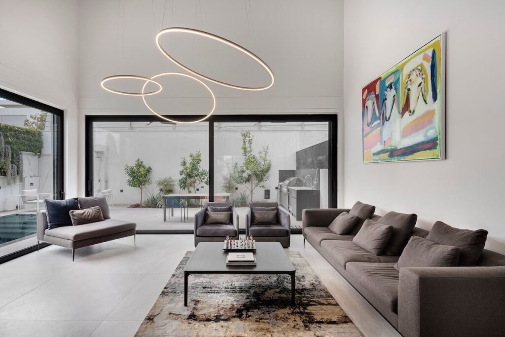 Obývací pokoj je umístěn pod dvojnásobnou výškou prostoru a má výhled na udržovanou zahradu, kde si rodina a její hosté mohou užívat bazén, venkovní kuchyni a jídelní a odpočinkové prostory. "Původně zde byla plánována vestavěná televizní stěna, kterou jsem prosadil otevřít, aby se prostor provětral a poskytl nerušený výhled zevnitř na venkovní zábavní prostor a bazén. Rozhodli jsme se pro sezení v teplém čokoládově hnědém odstínu, který navazuje na tóny dřevěného uhlí, a rovné linie rozbíjí minimalistický abstraktní koberec pod ním, doplněný trojicí jemných závěsných světel různých velikostí a úhlů, která se vznášejí nad ním. Originální umělecké dílo od Kedishmana zavěšené na stěně dodává prostoru dávku barev, života a humoru."