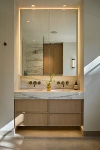 Srdce domu, kuchyň a neformální obytné prostory, mají výhled do zahrady, na kterou vede stupňovitá terasa. Dole se nachází nový suterén, který přidává další ložnici, posilovnu a vinotéku s pracovnou a hernou, která má ze spodní úrovně výhled do zahrady.
