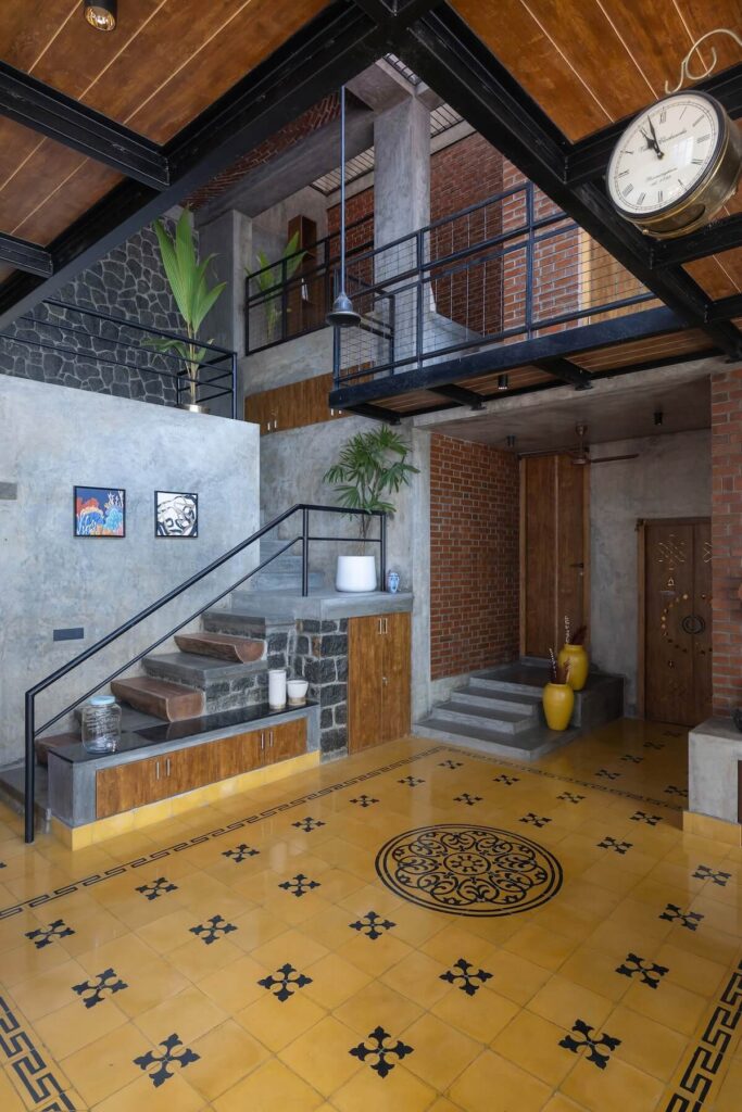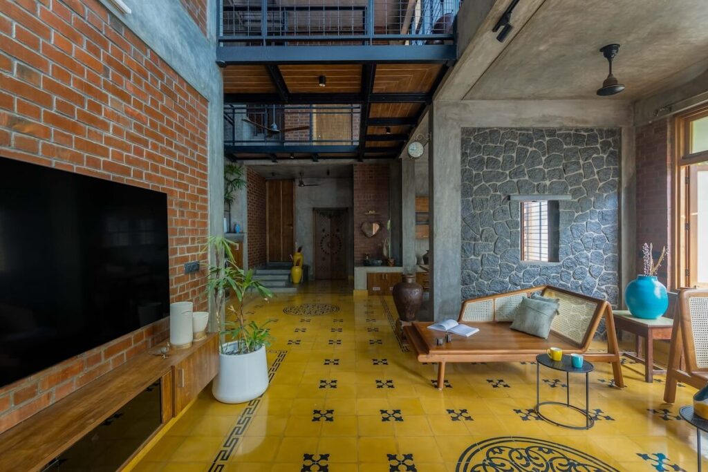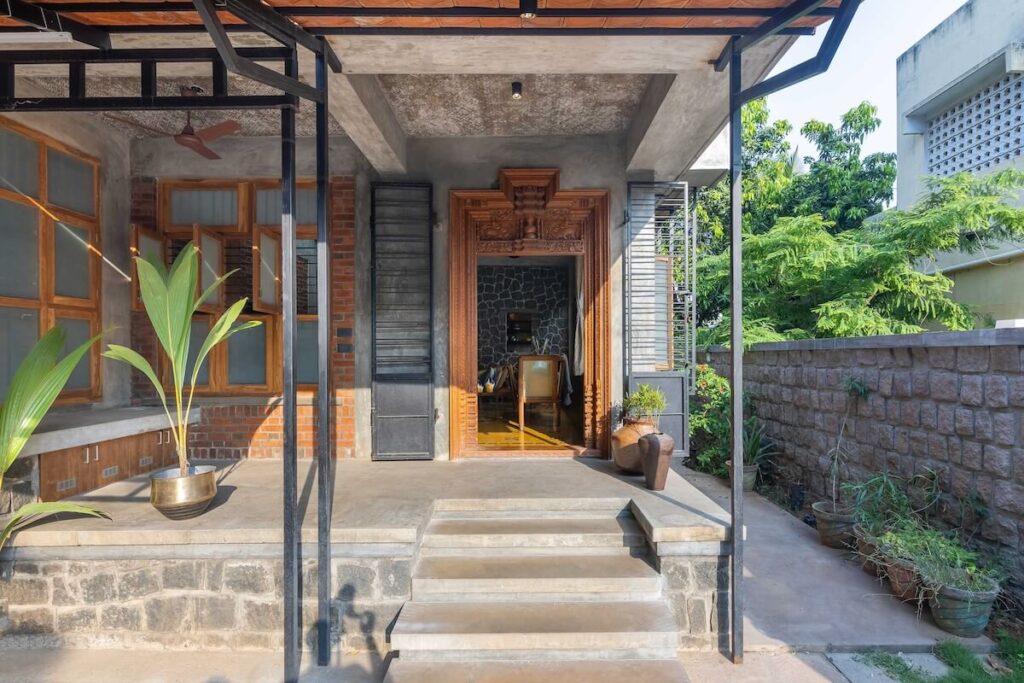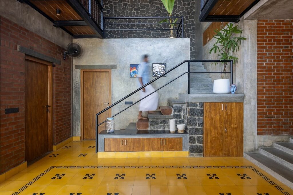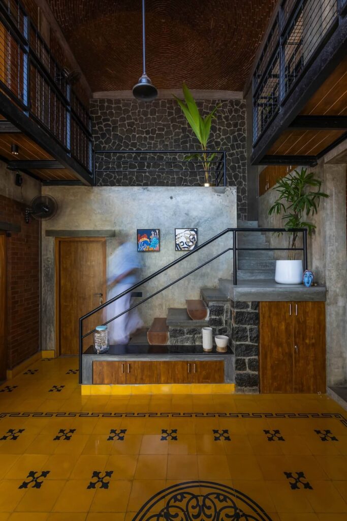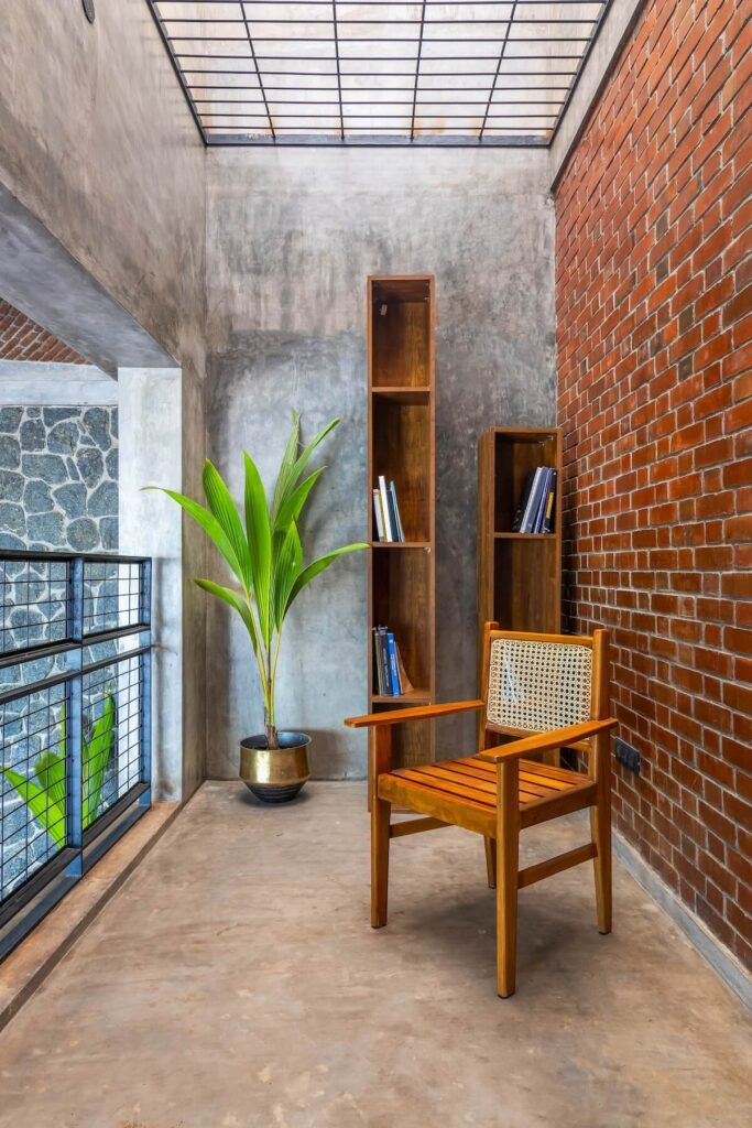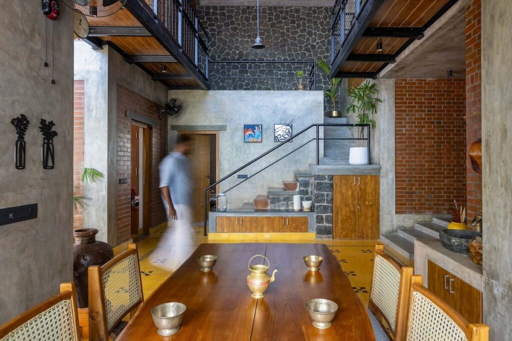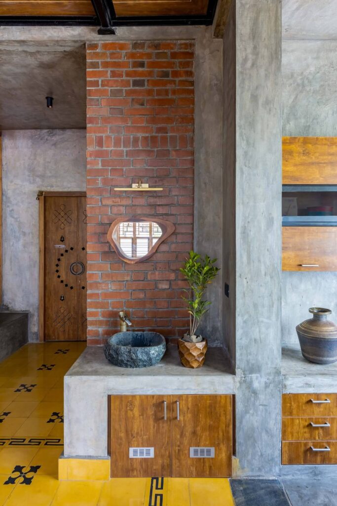 Každý prostor je vědomým spojením přírodních povrchových úprav, jako je odhalené cihlové zdivo a režné zdivo na stěnách, texturovaný odhalený beton, výplňová deska a cihlová kopule na stropě. Použití obkladů Athangudi a podlah z oxidu vytváří luxusní atmosféru a navozuje pocit nostalgie, protože časem elegantně stárne. Vyváženost přírodních povrchových úprav a tradičních živých prvků podtrhuje vřelost prostor a kovové a minimální dekory určují charakter prostoru. Příbytek odráží nadčasovou estetickou kvalitu a krásně stárne v průběhu času.