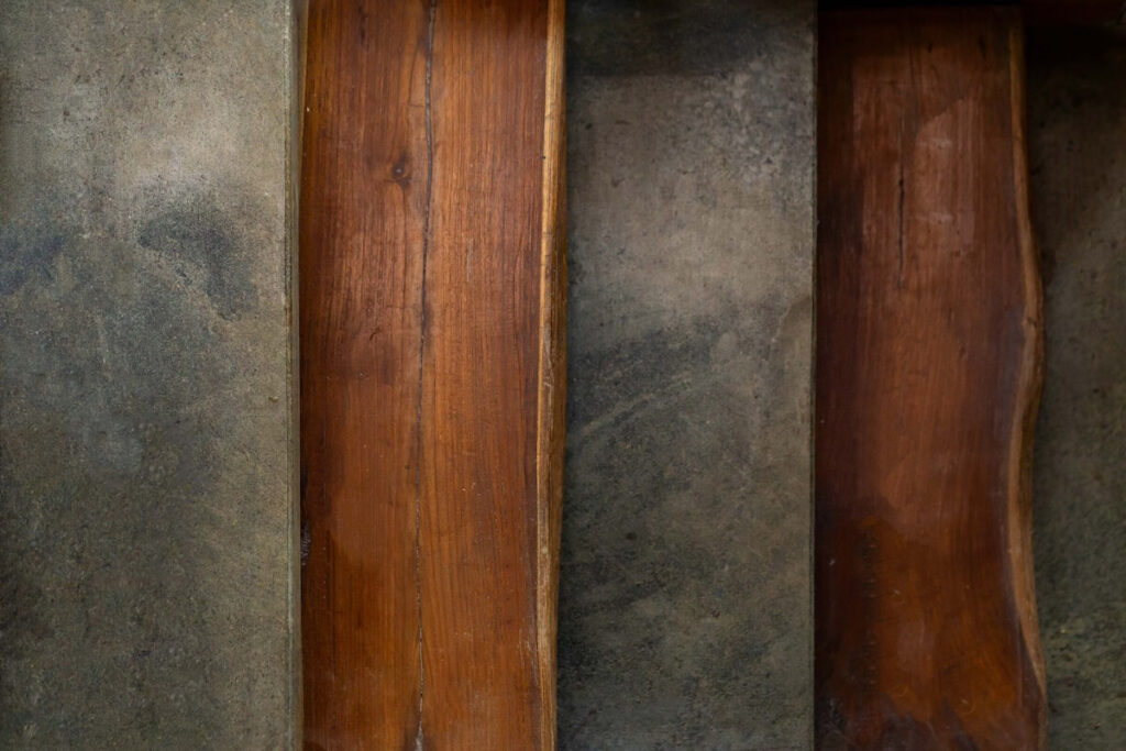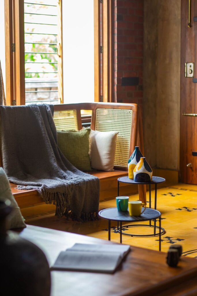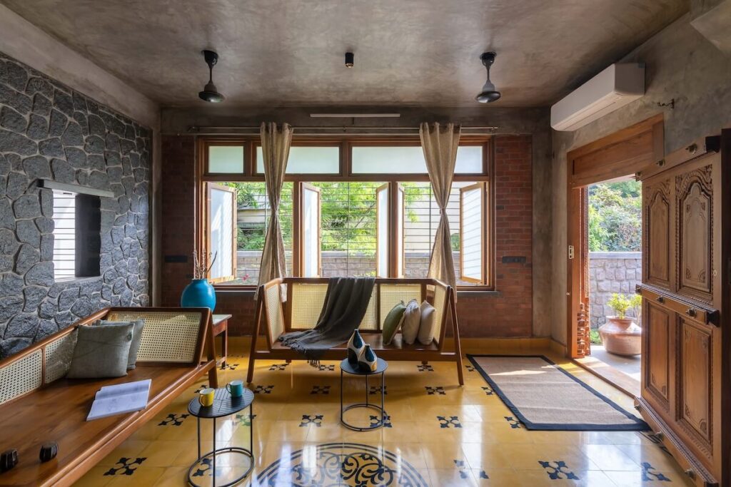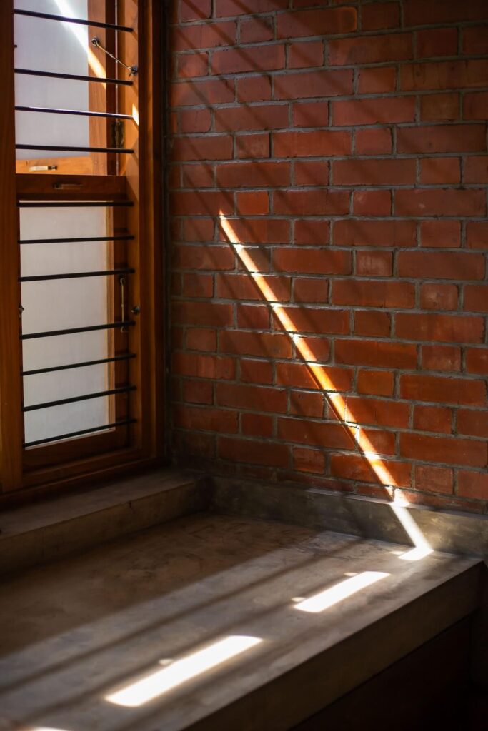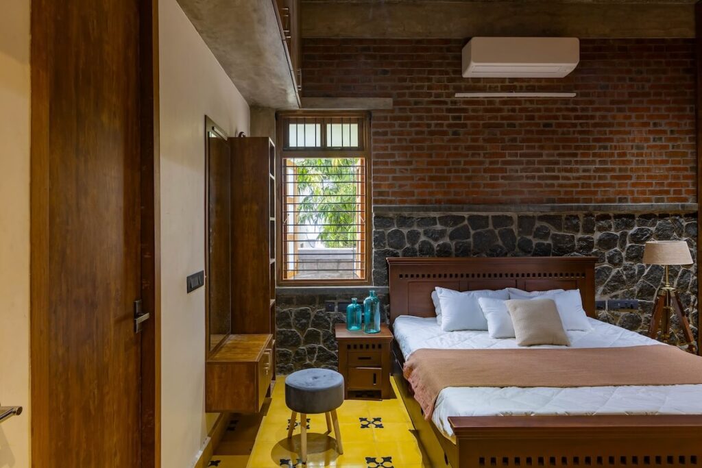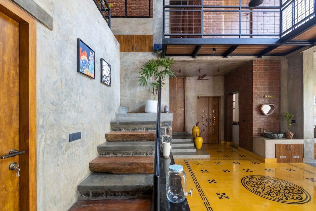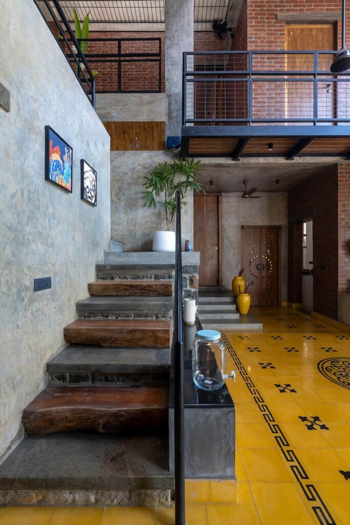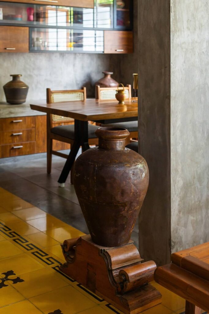 Každý prostor je vědomým spojením přírodních povrchových úprav, jako je odhalené cihlové zdivo a režné zdivo na stěnách, texturovaný odhalený beton, výplňová deska a cihlová kopule na stropě. Použití obkladů Athangudi a podlah z oxidu vytváří luxusní atmosféru a navozuje pocit nostalgie, protože časem elegantně stárne. Vyváženost přírodních povrchových úprav a tradičních živých prvků podtrhuje vřelost prostor a kovové a minimální dekory určují charakter prostoru. Příbytek odráží nadčasovou estetickou kvalitu a krásně stárne v průběhu času.