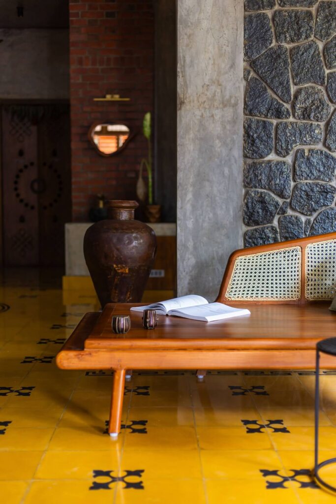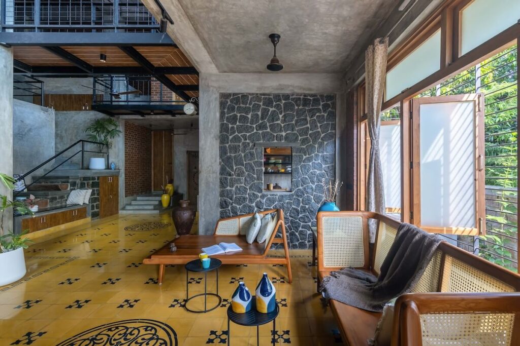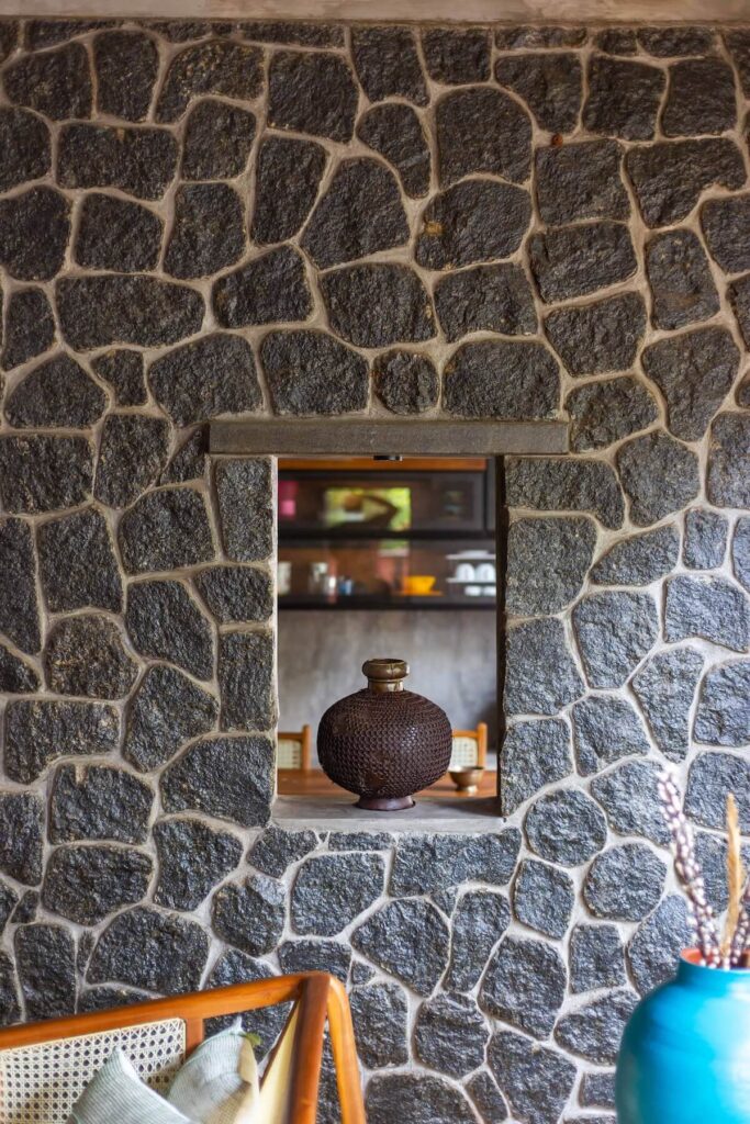 Téma stavebních materiálů, které chtějí být originální, je silně inspirováno Laurie Bakerovou - dále doplňuje prostory v podobě kamenů, dřeva, oceli a barevných dlaždic Athangudi (ručně vyráběné dlaždice z vesnice Athangudi). Prostory jsou také vědomým odrazem architektovy představivosti a ideálů, v nichž se neustále snaží narušovat stereotypy, k nimž patří těžké omítky, pozlacené kovové mříže za účelem bezpečnosti a dokonce i myšlenka " vznosného designu". Bohatství architektonického slovníku a kulturních prvků je cítit při zkoumání prvků navržených uvnitř.