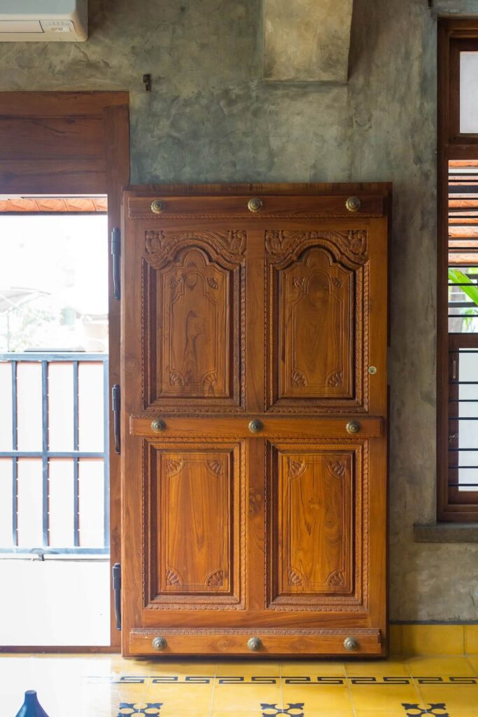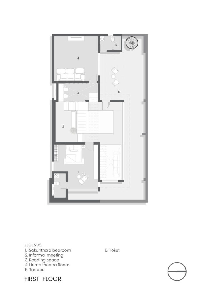 Bohatě zdobené dveře Chettinad zasazené do odhalené betonové a cihlové zdi orámované z obou stran krajinomalbou vtiskují člověku nostalgický vjem. Přístup k plánování začal vytvořením celků, na které byly přidány prostory vytvářející otevřenost. Ty jsou umístěny v hierarchii, která vybízí rodinu ke společnému setkávání a interakci. Obývací pokoj se otevírá do dvora s dvojnásobnou výškou a centrálním schodištěm zdobeným kamenem a dřevěnými stupni s malým vestavěným sezením. Vede do zajímavého společného foyer na úrovni prvního patra.