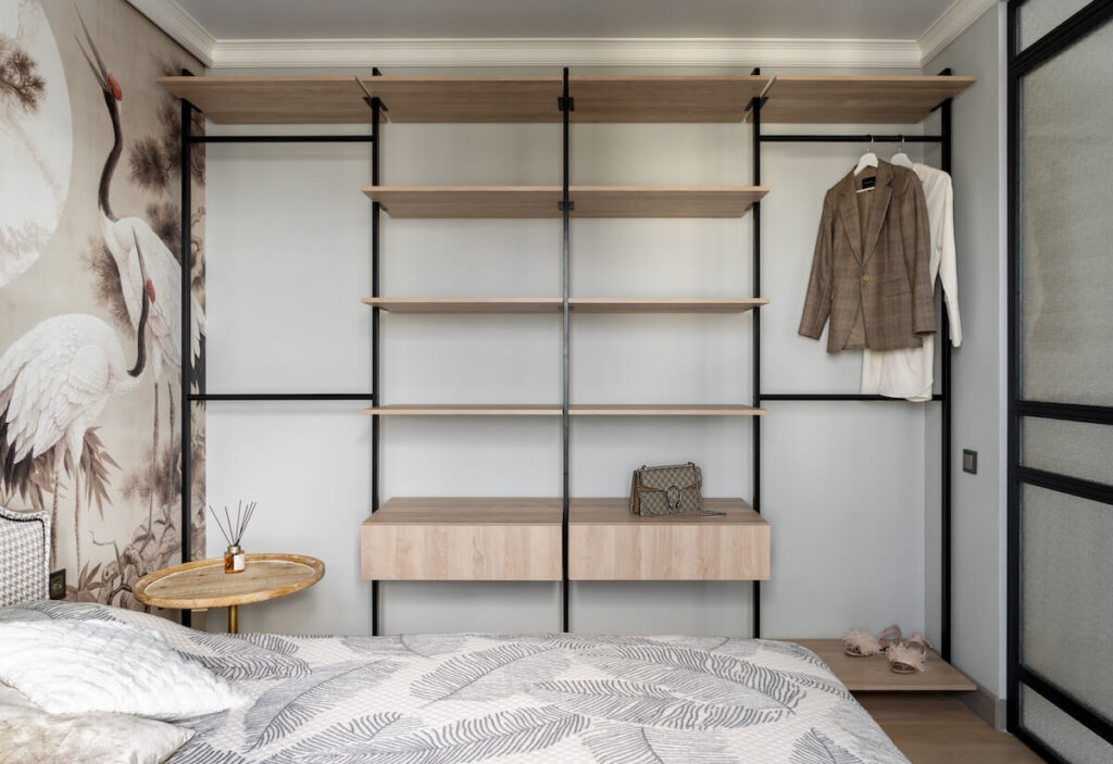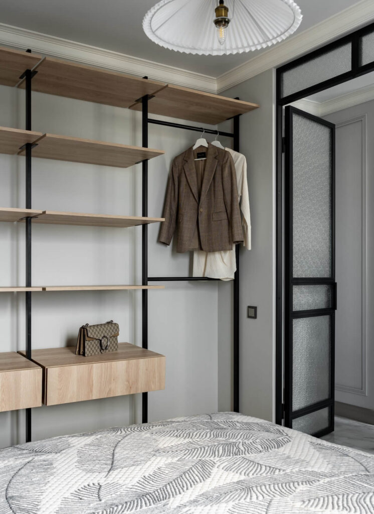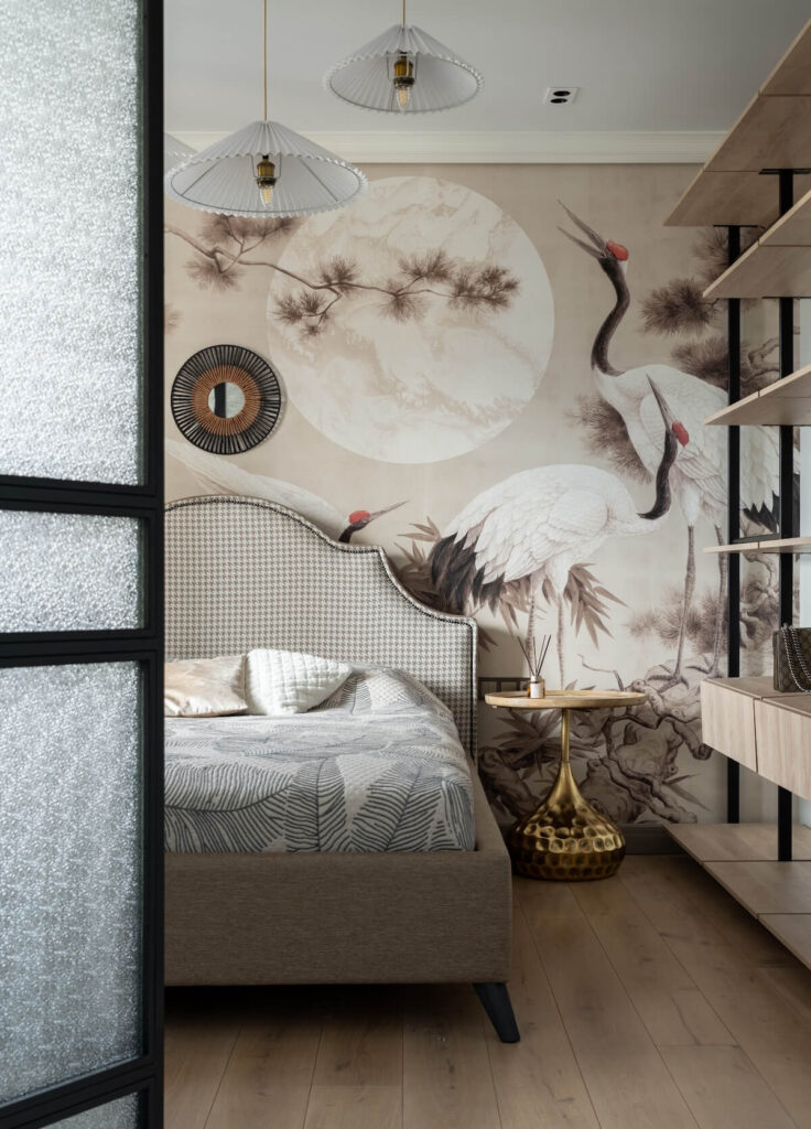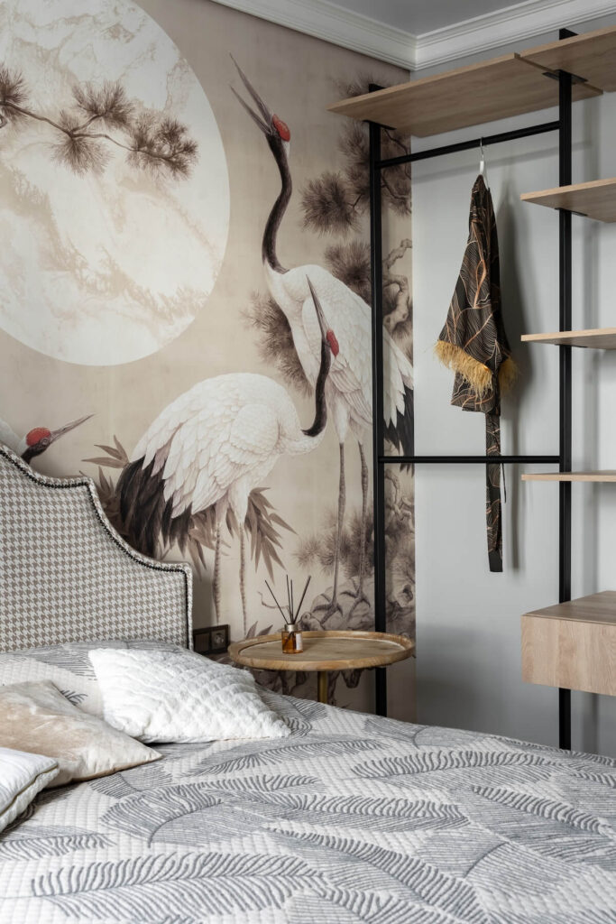 Maria si potrpí na styl wabi-sabi a miluje zajímavé akcenty, takže pro svou hlavní ložnici zvolila krásnou tapetu s etnickými motivy a s obrázkem jeřábů, tento detail zdůraznila díky papírovým závěsným stínidlům a figurálnímu čelu postele a místo standardní skříně se rozhodla umístit otevřenou šatnu, která se také stala nedílnou součástí tohoto interiéru.