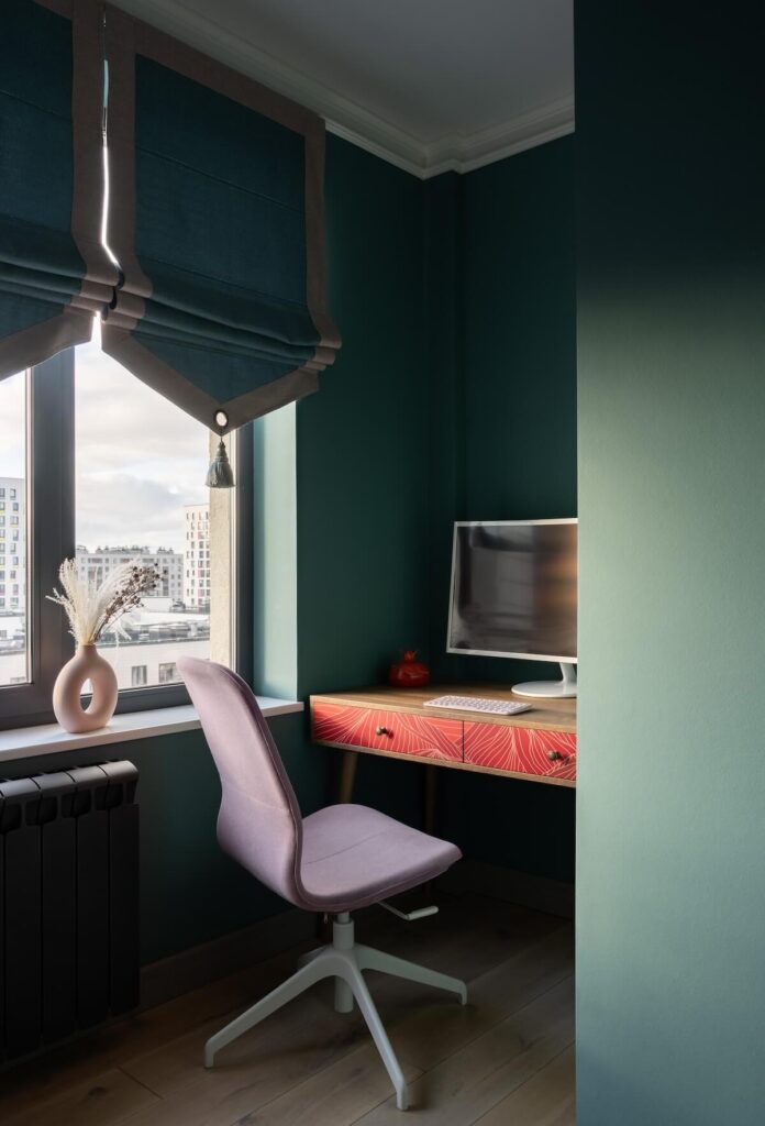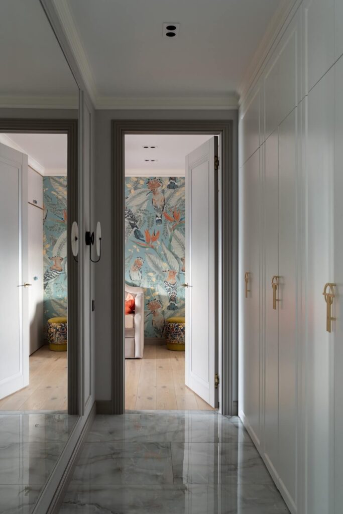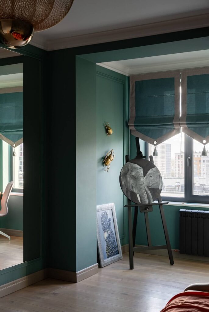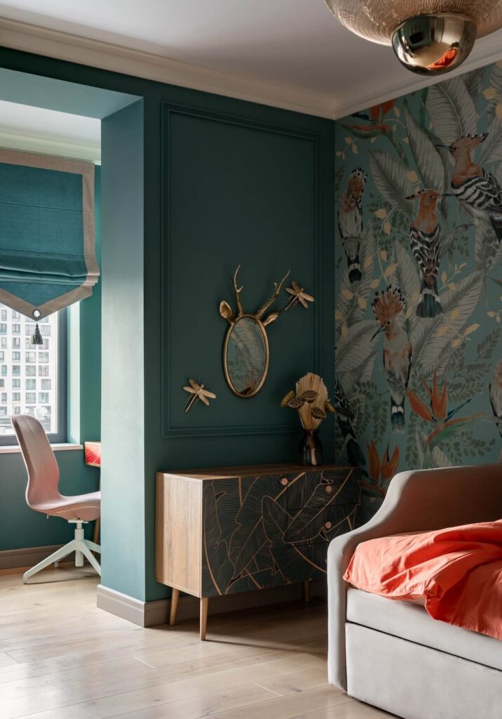 A samozřejmě si nelze nevšimnout světlého a detailně propracovaného dětského pokoje, jehož majitelkou je malá Sofie, která zbožňuje zvířata a ptáky. První, co uvidíme při vstupu do pokoje, je světlá a bohatá tapeta s drozdy - jako interiérový panel umístěný na jedné dlouhé stěně. A pak už drobné doplňky a dekorace jen umocňují pocit, že jsme vstoupili do nějakého pohádkového lesa - nástěnné figurky brouků a vážek, zrcadlo s jeleními parohy, nábytek a textilie s neobvyklými potisky - všechny tyto výrobky naši malou hostitelku potěší a dodají jí pocit kouzla.