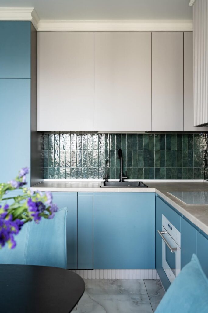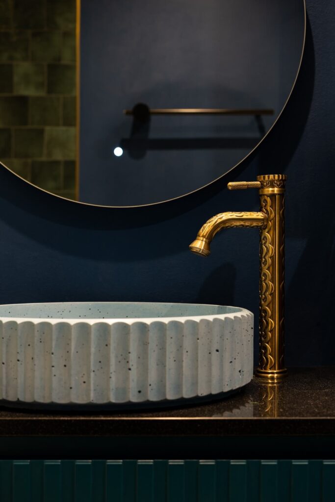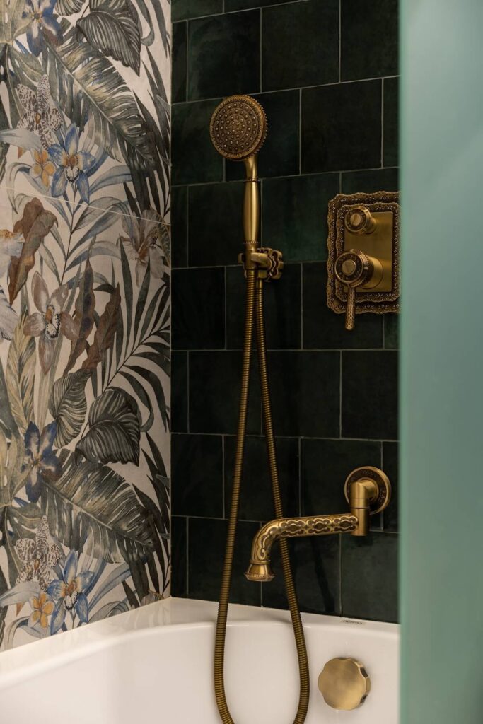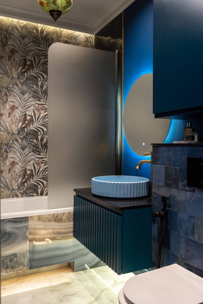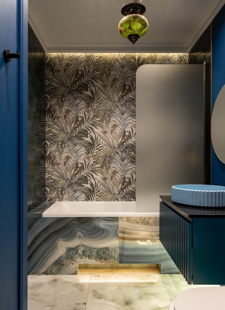 Zvláštní pozornost si zaslouží koupelna - bohatá a světlá, plná orientálních detailů, potisků a lesklých textur - je jedním z nejvýraznějších míst v bytě. Přívěsek, který si Maria přivezla z jedné ze svých cest do Turecka, glazované obklady v modrých odstínech, kapradiny s květinami v akcentech obkladů a samozřejmě umyvadlo, které okamžitě upoutá pozornost - to vše dohromady hraje a vytváří kouzelnou kompozici a dodává místnosti jedinečnou náladu a navozuje atmosféru tam, kde chcete být.