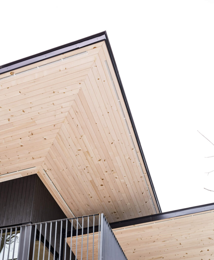 Výslednou podobu tvoří řada nízko položených tvarů začleněných do pozemku, které sjednocuje trojice formálně výrazných překrývajících se nepravidelných valbových střech s velkorysými přesahy směrem k jižní a západní fasádě. Tři střešní linie souvisejí s funkcí jednotlivých modulů, kde jsou sdílené obytné prostory určeny k přednímu bloku s výhledem na jezero, ložnice jsou v polovině bloku a poslední blok je uzavřená sluneční místnost s zástěnou Muskoka.