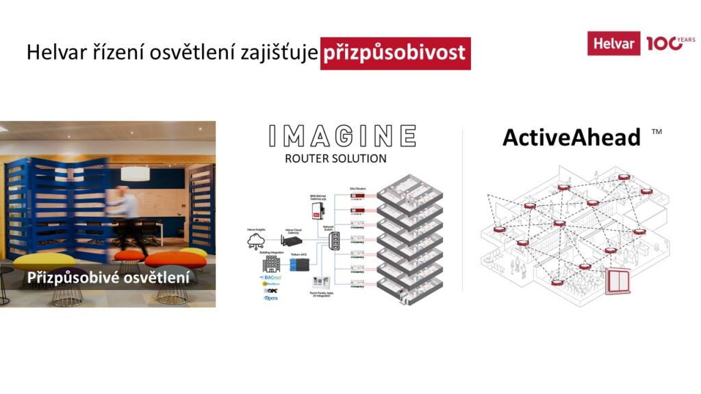IMAGINE – systém, který je mistr na wellbeing uživatelů a nabízí stovky světelných scén a přechodů a ovládání teploty chromatičnosti. Imagine se integruje se systémy BMS a nabízí integraci a skutečnou škálovatelnost od jedné místnosti až po celé budovy nebo areály. Imagine je řešení pro udržitelné řízení osvětlení ideální pro prostory vyžadující nastavené teploty chromatičnosti – studené světlo pro koncentraci v konferenční místnosti či teplé světlo pro relaxaci ve společenské místnosti či jídelně.