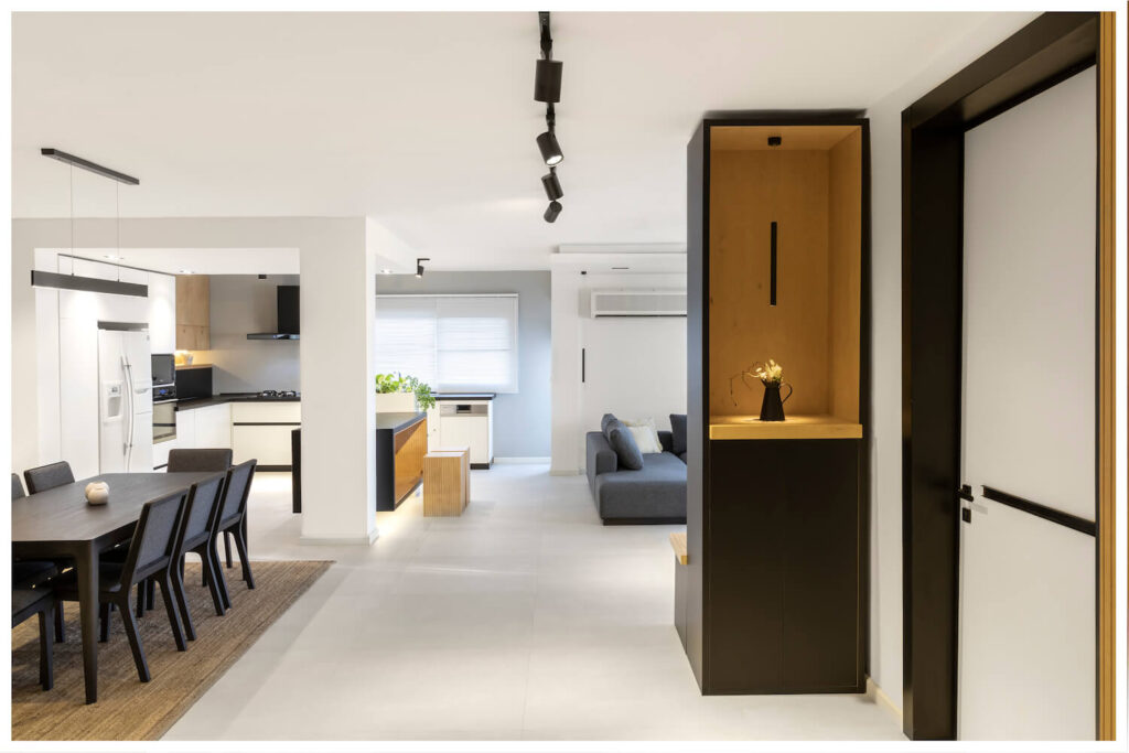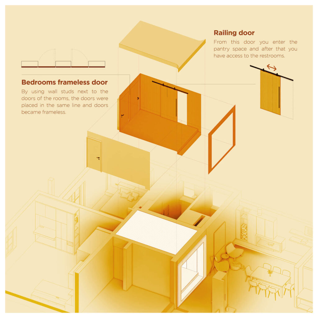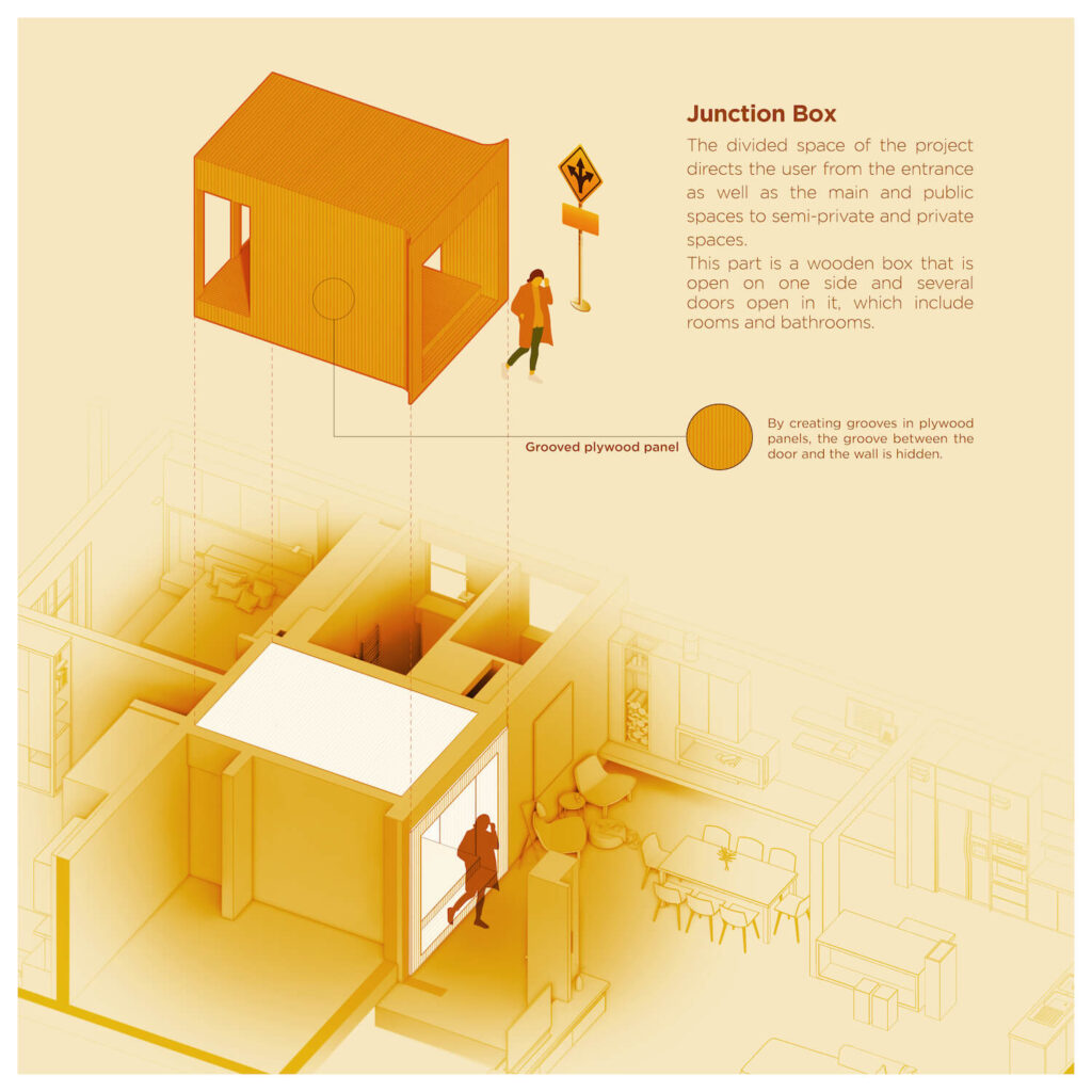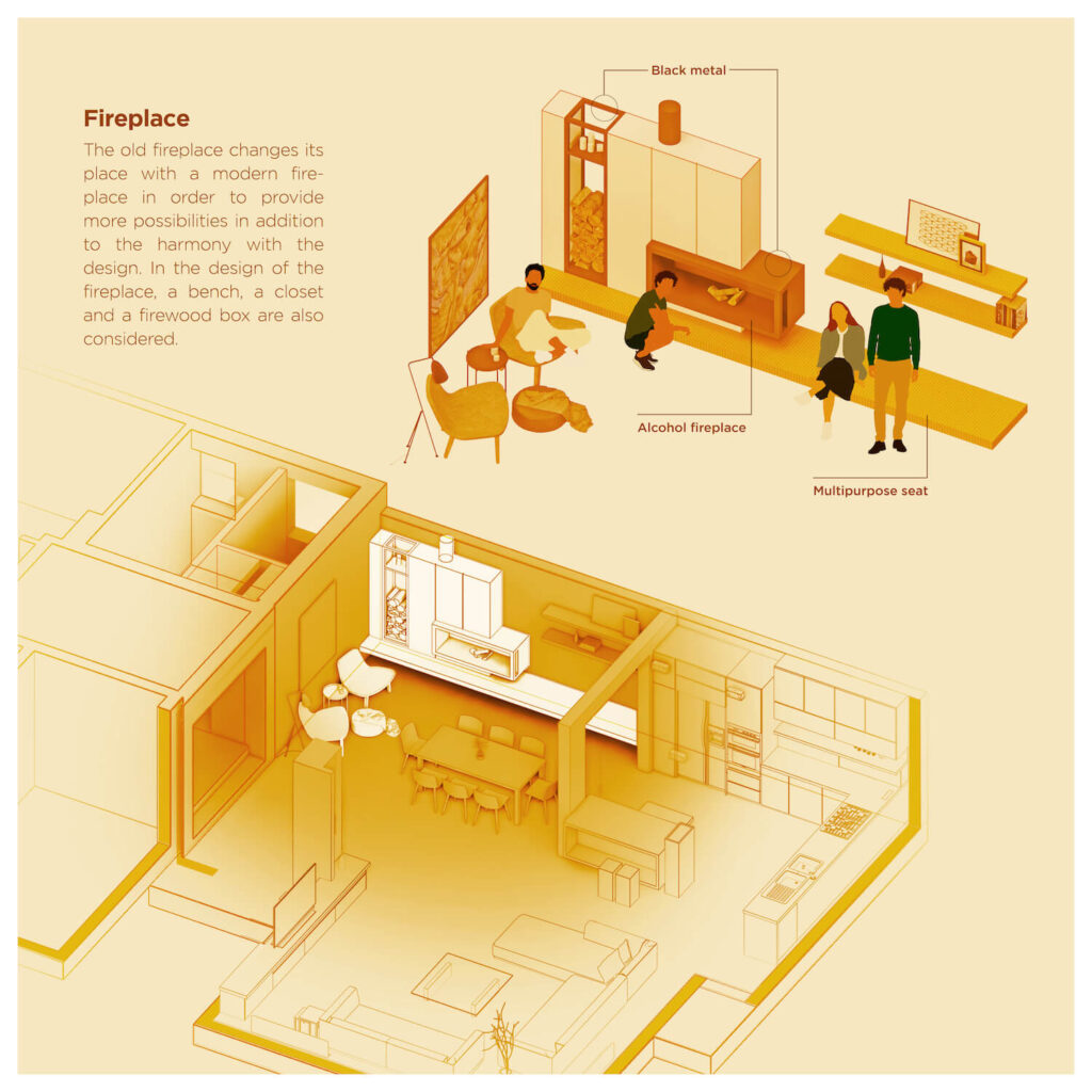 Neda Mirani: Při renovaci tohoto objektu se vycházelo z faktorů, jako je zvětšení prostoru prostřednictvím vizuální návaznosti mezi souvisejícími zónami, vytvoření funkčních průchodů, čitelnost a koordinace jednotlivých částí, více světla ve veřejné zóně a vnesení nového ducha do této bytové jednotky. Aby bylo možné těchto požadavků dosáhnout, prošel plán změnami v umístění, rozměrech a také typu přístupu k prostorům, navíc s ohledem na omezení, která existovala vzhledem ke stáří nemovitosti.