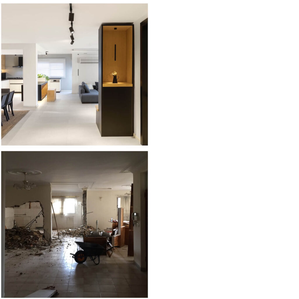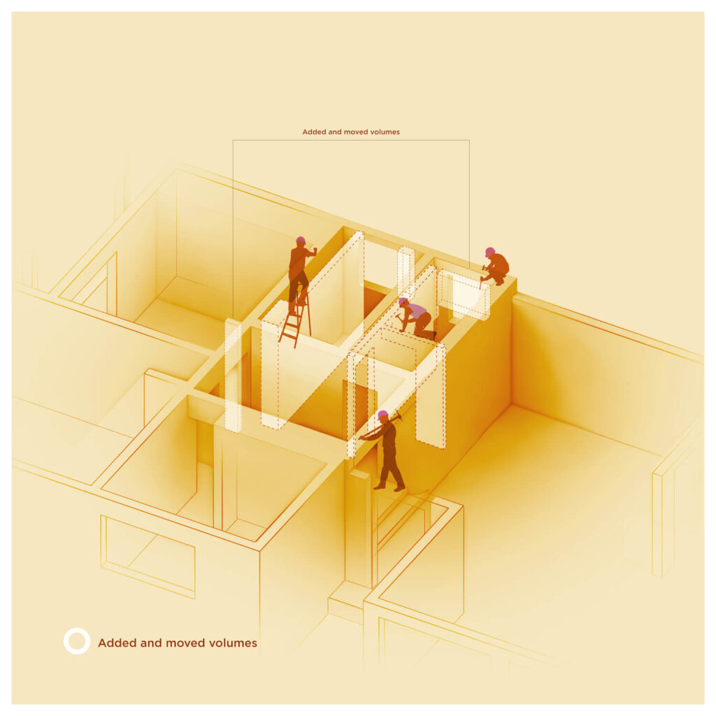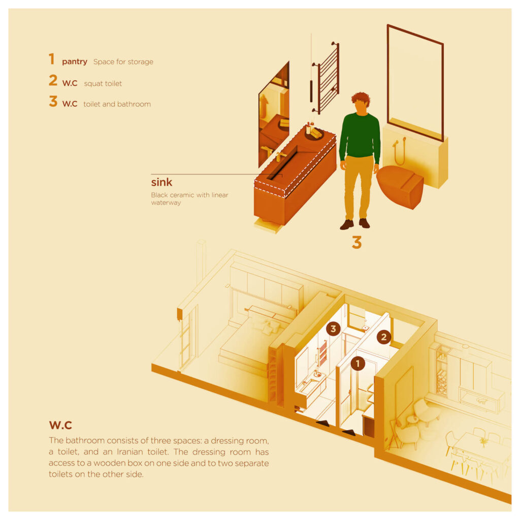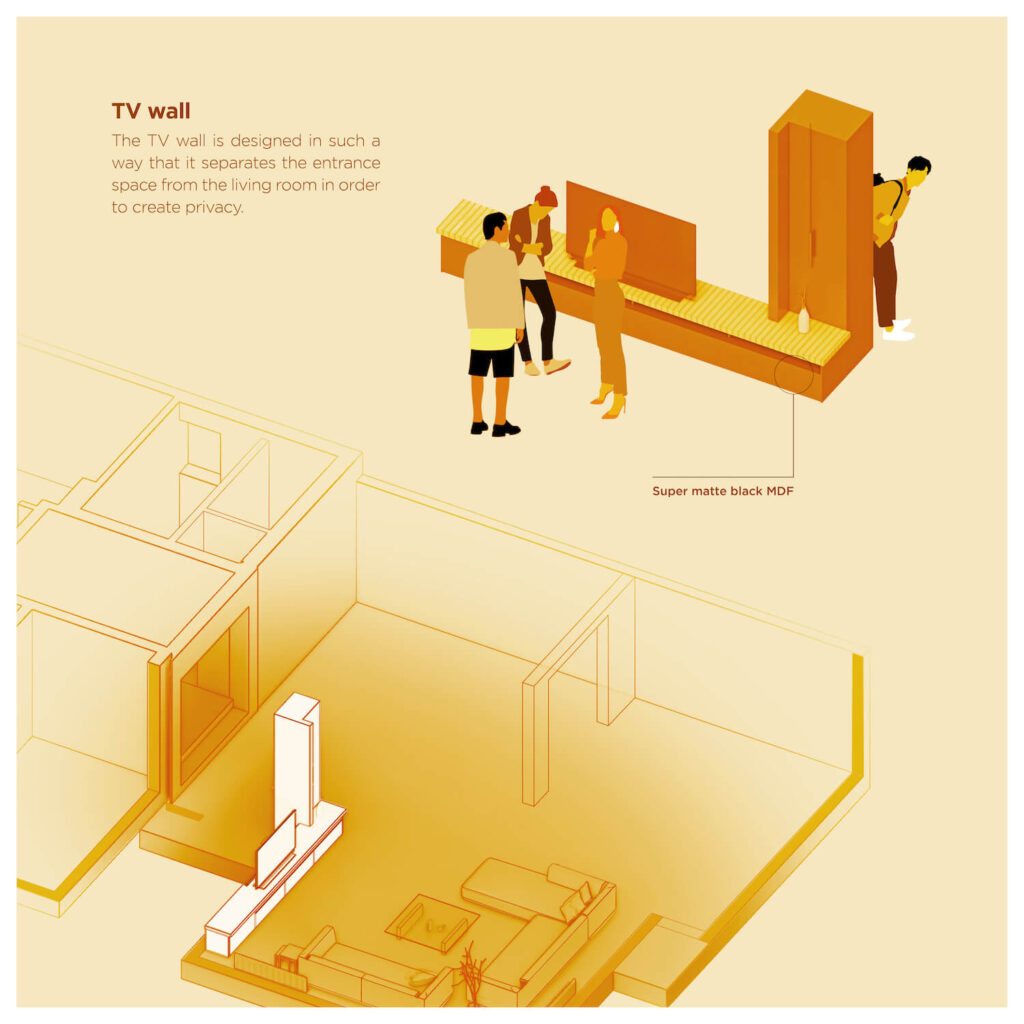 Neda Mirani: Při renovaci tohoto objektu se vycházelo z faktorů, jako je zvětšení prostoru prostřednictvím vizuální návaznosti mezi souvisejícími zónami, vytvoření funkčních průchodů, čitelnost a koordinace jednotlivých částí, více světla ve veřejné zóně a vnesení nového ducha do této bytové jednotky. Aby bylo možné těchto požadavků dosáhnout, prošel plán změnami v umístění, rozměrech a také typu přístupu k prostorům, navíc s ohledem na omezení, která existovala vzhledem ke stáří nemovitosti.