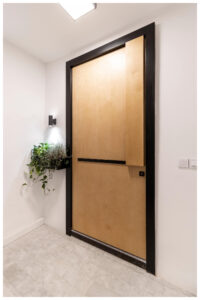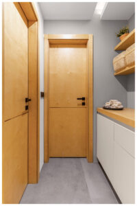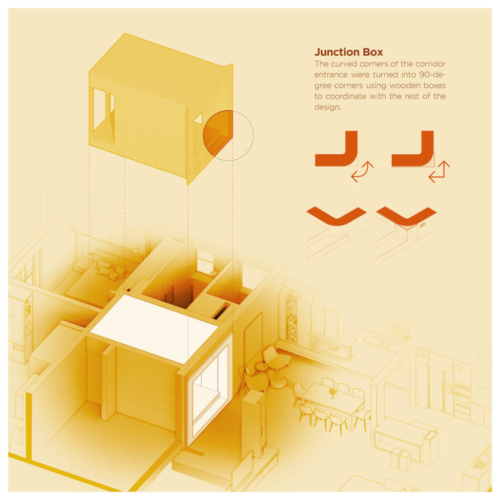 Ve středním prostoru vstupu do ložnic a pokojů bylo cílem eliminovat přímý a nezprostředkovaný přístup do pokoje a koupelny, aby se minimalizoval výhled do přijímacího prostoru. Za tímto účelem byl odstraněn jeden z průchodů pokoje a koupelny do středního prostoru haly a vymezením prostoru v této části byl zajištěn přístup do koupelny a WC. Za účelem oddělení a odlišení byl do této části přidán dřevěný box s jednoduchým překližkovým materiálem. Aby byla zachována čistota, byly pomocí této dřevěné skořepiny všechny dveře ložnice opatřeny skrytými zárubněmi, což tomuto prostoru dodalo vzhled bezrámových dveří. Také v oblasti ložnice byla snaha vytvořit optimálnější prostor pro odpočinek a práci s různým umístěním skříní a změnami jejích rozměrů.