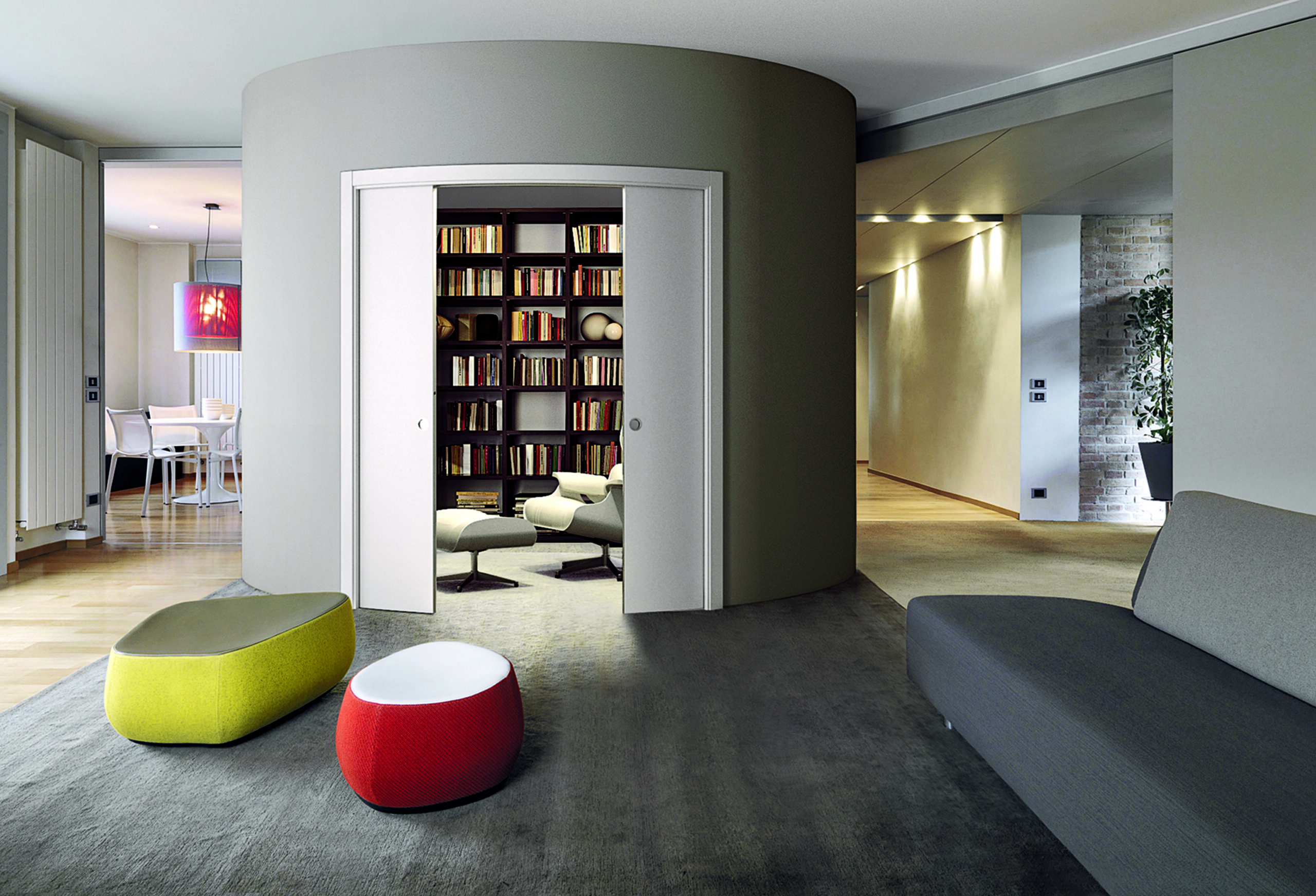 Pouzdro ECLISSE Cirkulár umožňuje vložit posuvné dveře do zakřivené stěny, kdy dveřní křídlo „mizí“ v pouzdře při otevření. Tato konstrukce otevírá zcela nové možnosti při navrhování interiérů – odstraníte ostré hranice mezi místnostmi a nahradíte je plynulými, měkkými oblými liniemi, které opticky zvětšují prostor a dodávají mu charakter.