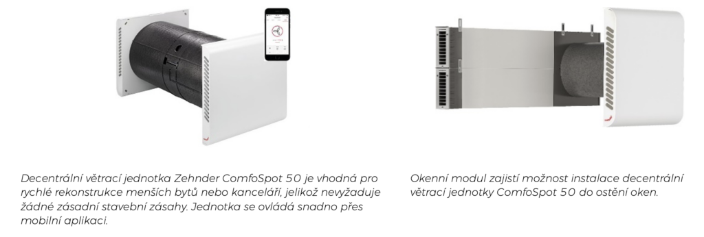 Komplexní systémy řízeného větrání Zehnder nabízí řešení na míru pro každou rekonstrukci. „S uceleným systémem Zehnder, který sestává z větracích jednotek, hygienických rozvodů, tlumičů hluku, rozdělovačů a prvků pro přívod a odvod vzduchu, kvalitních filtrů i designových ventilů, lze jednoduše zvládnout každou stavební situaci“, chválí Ing. Šubrt praktičnost systému Zehnder pro potřeby rekonstrukcí. Promyšlené komponenty na sebe navazují, dokonale těsní, jsou vzájemně sladěné a usnadňují instalaci i následnou údržbu. Obrovskou výhodou větrání Zehnder při využití v rekonstrukcích je pak variabilita jeho systémů. „Zehnder nabízí nejrůznější centrální větrací jednotky včetně kompaktních jednotek s možností umístění v prostorách kuchyňské linky nebo koupelnové niky Zehnder ComfoAir 180, ale například i revoluční novinku – plochou větrací jednotku Zehnder ComfoAir Flex, kterou lze umístit i do stropního podhledu. Velmi praktické jsou pak decentrální jednotky ComfoSpot 50 a ComfoAir 70 včetně okenního modulu pro umístění ventilace v ostění oken,“ vypočítává možnosti komfortního větrání Zehnder pro rekonstrukce odborník. I na minimálním prostoru tak lze docílit komfortu a vysoké účinnosti větrání.