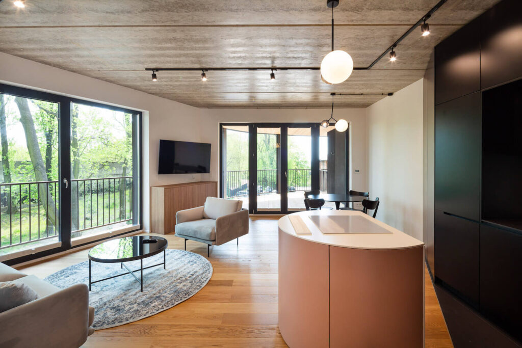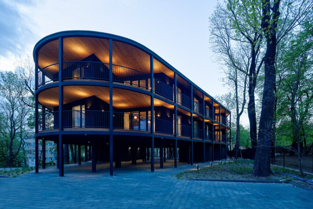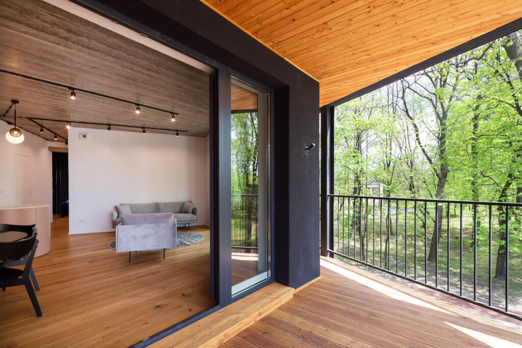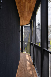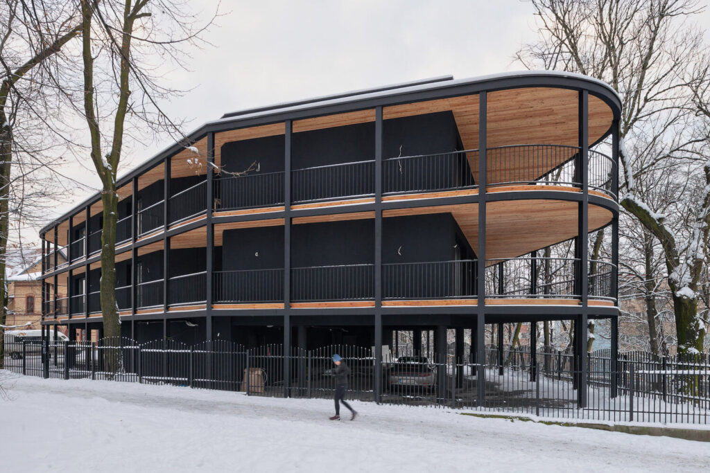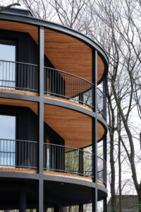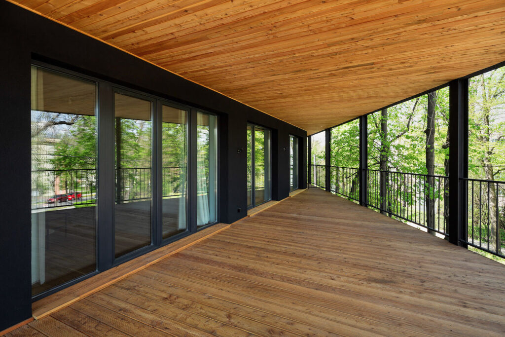 Poté byla podél hranic pozemku vyznačena obvodová linie a blok bytů byl obklopen balkony, aby se dosáhlo panoramatického otevření do okolí. Vzhledem k ostrým úhlům (v daném kontextu cizím) bylo rozhodnuto o zaoblení rohů s odkazem na charakter meziválečných vil v sousedství, koruny stromů a okolní zeleň. V dalším kroku, aby se otevřel výhled do okolí, byl blok oděn do dřevěných vyhlídkových teras s různými povrchy kolem, do formy byl zaveden vnitřní zlom realizací terasy pro osvětlení vnitřních částí bytů (koupelen a vstupních prostor do bytů) a podlaha obytné části byla zvýšena o jednu úroveň, přičemž nezastavěné přízemí bylo ponecháno jako prostor pro společenské interakce obyvatel a další vnější funkce.