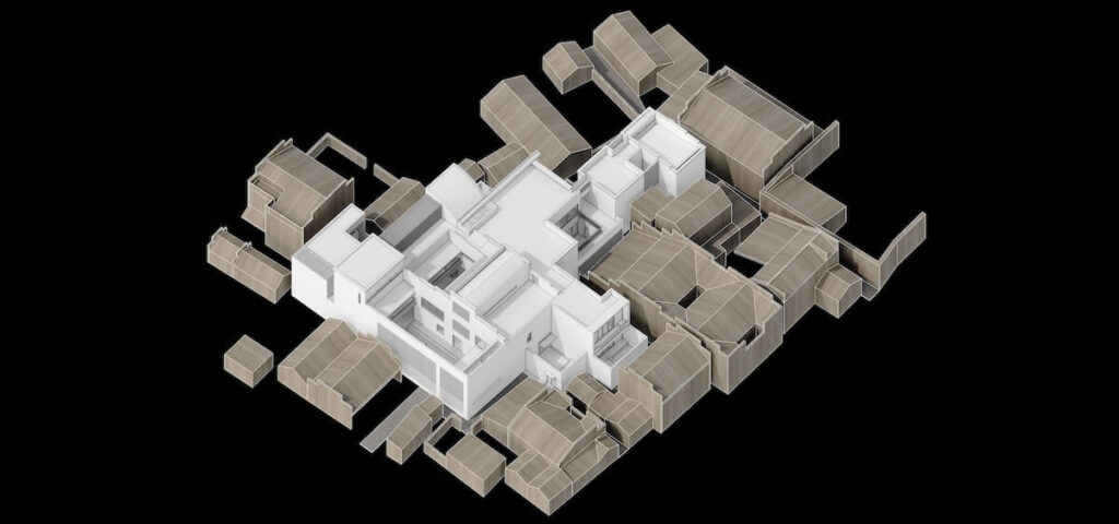 Když jsem však stál na místě, zaujalo mě malebné okolí - šedé dlaždice, bílé zdi a stupňovité štíty. Vzdálený kouř z vaření, zvuky rozhovorů a vůně jídla vytvářely jedinečnou atmosféru. Tento zážitek mě inspiroval k tomu, abych odložil své předsudky a přijal krásu, která je tomuto místu vlastní. Představoval jsem si začlenění budovy do vesnice a vytvoření odlehlého prostoru, který by ladil s okolím a zároveň nabízel ostrý kontrast k okolnímu živému a rozmanitému prostředí.
